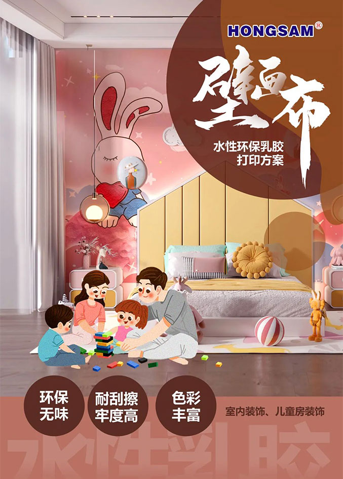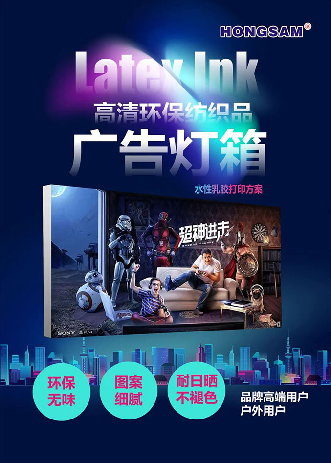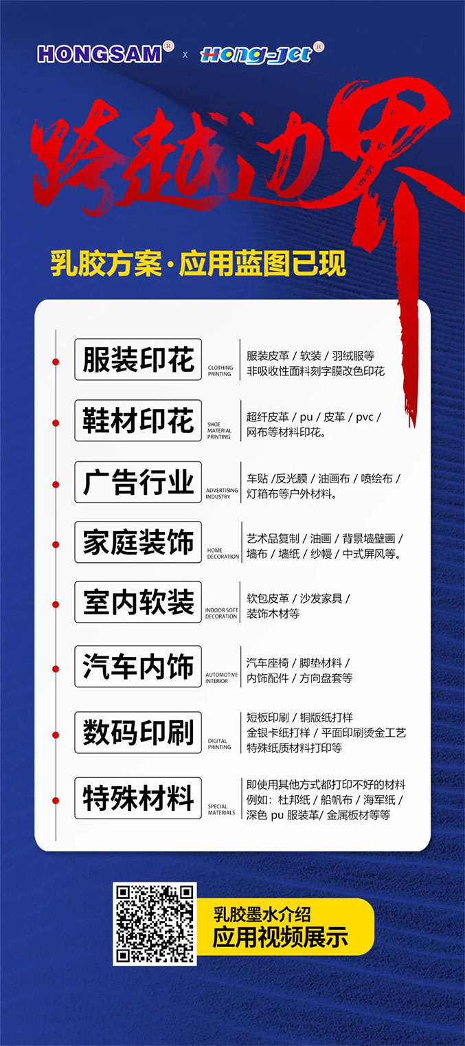 鴻盛數碼乳膠打印方案自2021年問世至今,已完成了數百種材料的打印測試,目前鴻盛數碼鴻捷事業部相繼開發出了1.3米、1.8米、3.2米幅寬的乳膠打印設備,針對不同行業、不同材質、不通過應用方向。水性乳膠打印方案所做的是一個新的工藝技術,更是突破行業瓶頸、引領引導行業發展的大創新。