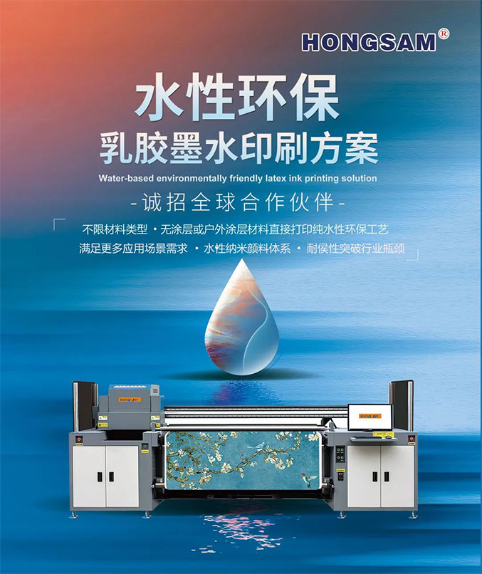 不出意料,是鴻盛數碼的水性環保乳膠墨水印刷方案,在行業競爭如此激烈的當下,設備廠家產能部分過剩,工藝同質化嚴重、市場競爭激烈、訂單價格白熱化競爭,乳膠方案的出現為當下市場帶來了新的發展機遇。