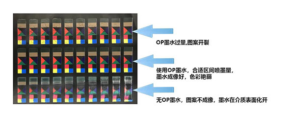 如上圖所示,乳膠墨水分為OP(optimizer)墨水與彩色墨水,OP墨水與彩色墨水由噴頭噴射后在介質表面迅速反應、結合成像,后經合適的溫度烘干,完成打印流程。OP墨水在打印過程中具有鎖定彩色墨滴與產生牢度的作用。