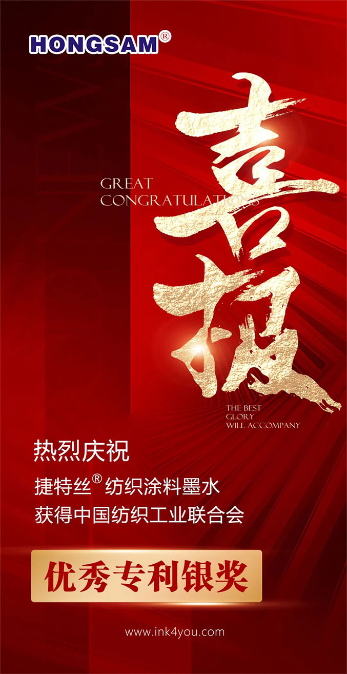 日前,中國紡織聯合會發布《2022年度中國紡織工業聯合會優秀專利的通知 》,鴻盛數碼研發的“捷特絲®”紡織涂料墨水獲2022 年度中國紡織工業聯合會優秀專利” 銀獎。