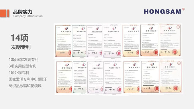 鴻盛數碼通過持續技術研發及工藝創新,降低了客戶對進口墨水的依賴度及采購成本,促進行業向節能環保、清潔生產方向轉型。企業針對不同系列產品,建立專項研發項目組,保證每款產品的持續跟進優化。截止目前,鴻盛數碼擁有14項專利,其中10項國家發明專利,其中8項為數碼印花類的專利,囊括鴻盛數碼紡織五朵金花“絲美特®”酸性染料墨水、“鴻美®”高溫分散墨水,“捷特絲®”紡織涂料墨水、“銳美®”活性染料墨水、鴻盛陽離子染料墨水。