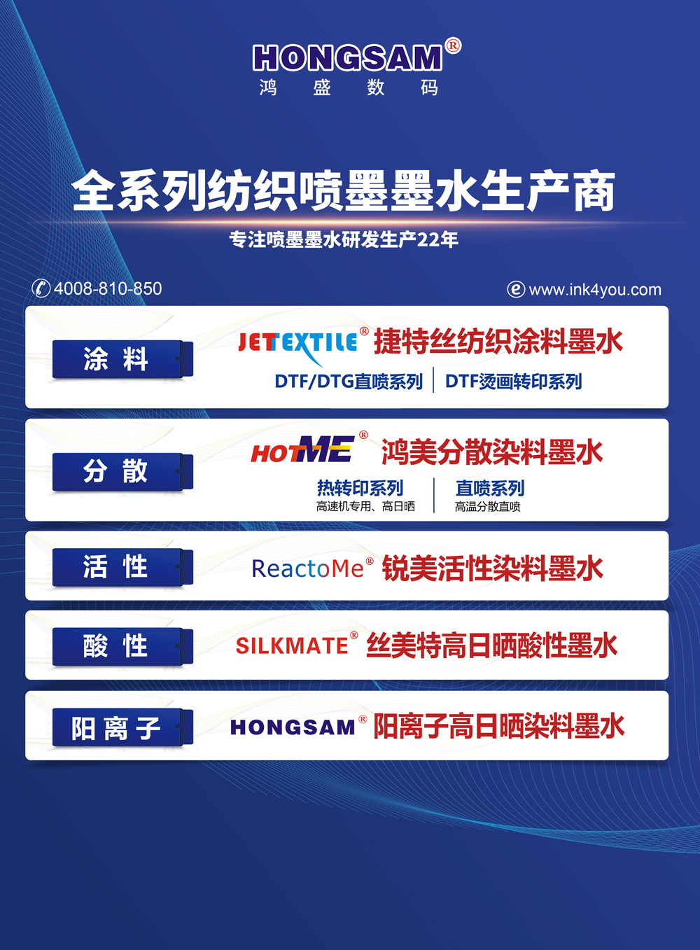 “捷特絲®”紡織涂料墨水作為國內推出較早的一款納米顏料數碼噴墨墨水,在2006年就獲得了該墨水的發明專利,也受到了國家創新基金立項支持及市場推廣應用,同時,鴻盛數碼也參與制定行業標準,宣貫標準,為中國噴墨顏料墨水應用,引導和開辟了道路。 “捷特絲®”紡織涂料墨水彌補了國內納米顏料數碼噴墨的不足,在牢度、手感、顏色、流暢性方面都有不錯的表現,滿足客戶對棉,滌棉,滌錦,棉錦,滌綸,錦綸,絲綢等面料的應用,可謂是一種墨水,所有織物。捷特絲紡織墨水的相關介紹見《緊隨市場腳步 | 鴻盛數碼20年深耕紡織涂料市場》