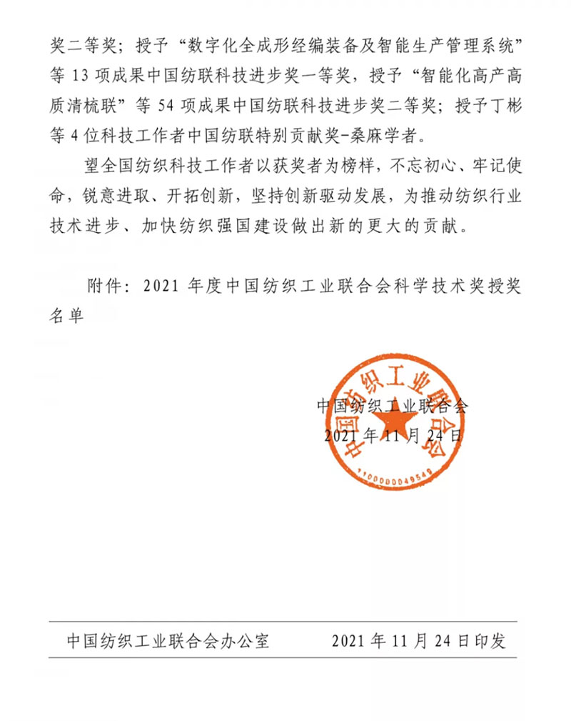 中國紡織工業聯合會科學技術進步獎是經國家科技部國家科學技術獎勵工作辦公室批準設立的,面向全國紡織行業唯一的科學技術獎。