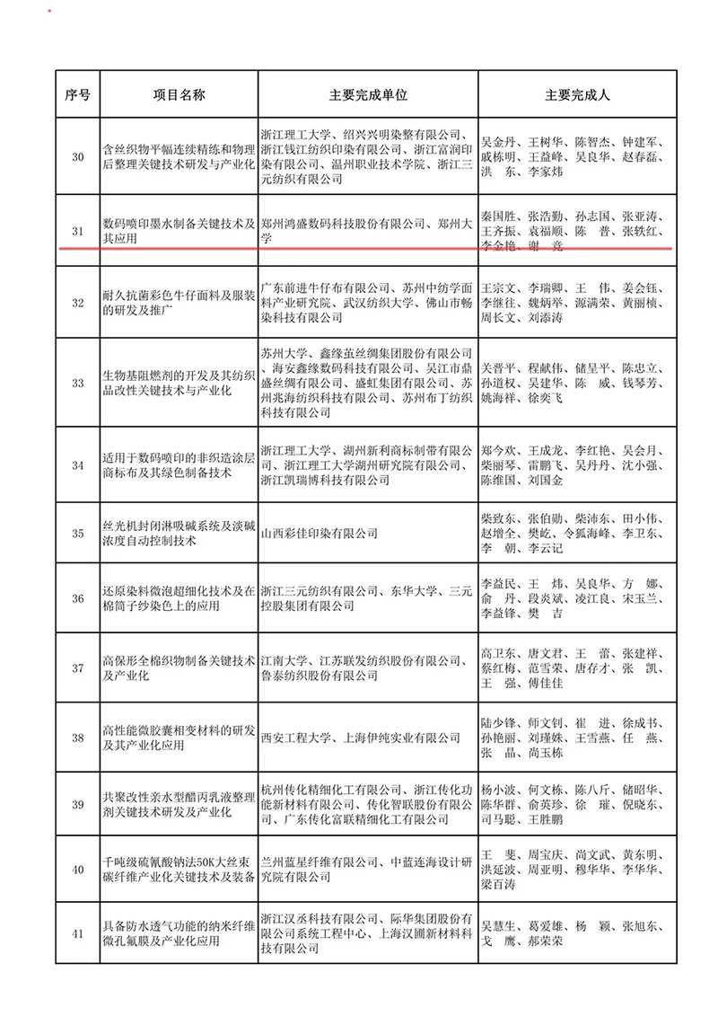 近日,中國紡織工業聯合會科技發展部網站發出通知——《關于 2021 年度中國紡織工業聯合會科學技術獎勵的決定》(中國紡聯【2021】58號)。《決定》顯示,2021年,全國共有76個項目獲得了獎勵,其中技術發明獎5項,科技進步獎67項,桑麻學者4位。鴻盛數碼和鄭州大學合作的“數碼噴印墨水制備關鍵技術及其應用”獲得科技進步二等獎。