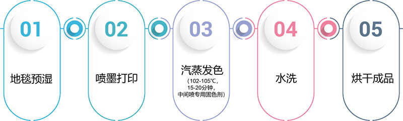 陽離子染料墨水印花具有顏色鮮艷、地毯上滲透性高、超高的日曬牢度、汽蒸發色耗能低、節能環保的優點,通過固色劑處理的部分,成品也可以做到免水洗、減少污水排放、降低企業排污壓力。