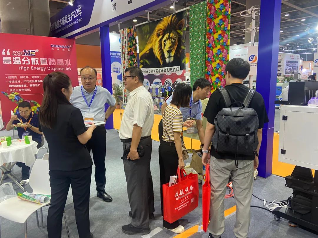 此次展會(huì)現(xiàn)場(chǎng)打印以紡織涂料印花為主,展示了鴻盛數(shù)碼自主開發(fā)的jetall水性乳膠打印方案及鴻捷dtf無(wú)粉燙畫方案。除了吸引不少國(guó)內(nèi)外觀眾的圍觀,同時(shí)一些設(shè)備廠家專程過來(lái)鴻盛數(shù)碼展位交流。展位現(xiàn)場(chǎng)還展示了“捷特絲®紡織涂料墨水”“銳美®活性染料墨水”“絲美特®酸性染料墨水”“鴻美®分散直噴墨水”“hongsam®陽(yáng)離子染料墨水”打印不同材質(zhì)的樣品,全面展示了鴻盛豐富的數(shù)碼印花方案。尤其是采用“鴻美®”高溫分散直噴墨水配套single="" pass打印毛毯材質(zhì),更是吸引了不少觀眾的贊譽(yù)。