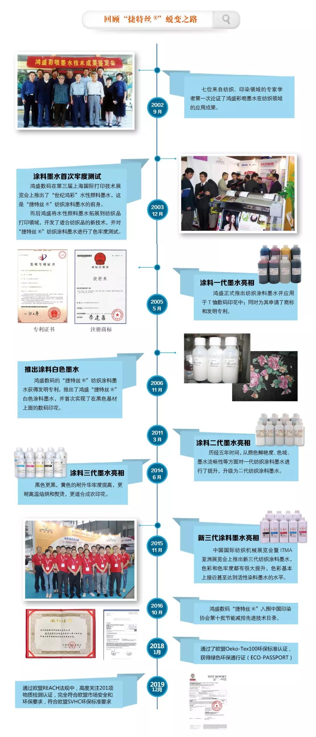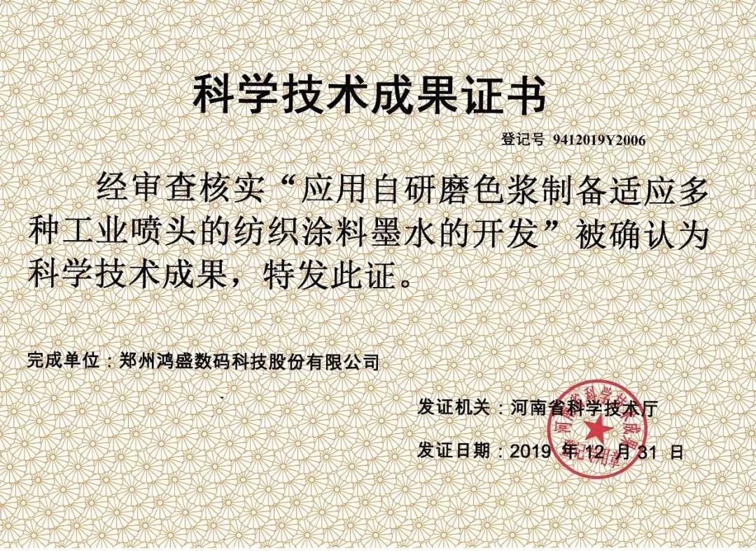 鴻盛數(shù)碼的主打產(chǎn)品—“捷特絲”紡織涂料直噴數(shù)碼印花墨水已推廣了數(shù)十年,產(chǎn)品日臻成熟,并在市場上有一定占有率。此次,“應(yīng)用自研磨色漿制備適應(yīng)多種工業(yè)噴頭的紡織涂料墨水的開發(fā)”被確認(rèn)為科學(xué)技術(shù)成果,也是對鴻盛紡織涂料墨水的認(rèn)可與肯定。