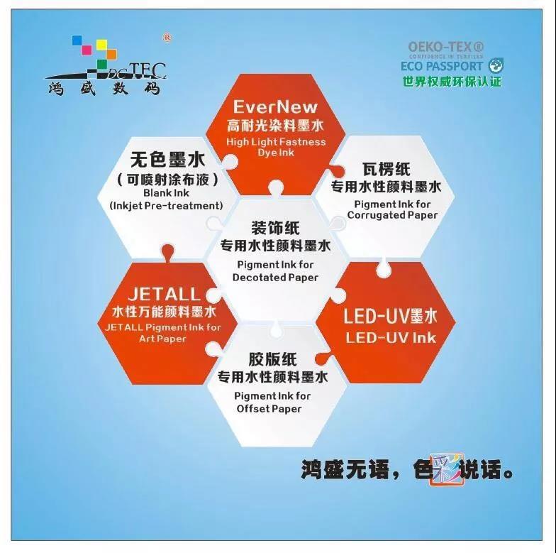 鴻盛數(shù)碼作為一家專注18年噴墨墨水生產(chǎn)研發(fā)的上市企業(yè),在本次展會將攜全系列數(shù)碼印刷墨水亮相展會現(xiàn)場。現(xiàn)場更有RCT技術(shù)牛皮紙、裝飾紙無涂層打印以及鴻盛數(shù)碼專業(yè)的技術(shù)團(tuán)隊(duì)與您現(xiàn)場分享與交流。精彩紛呈,誠意相邀您的到來!