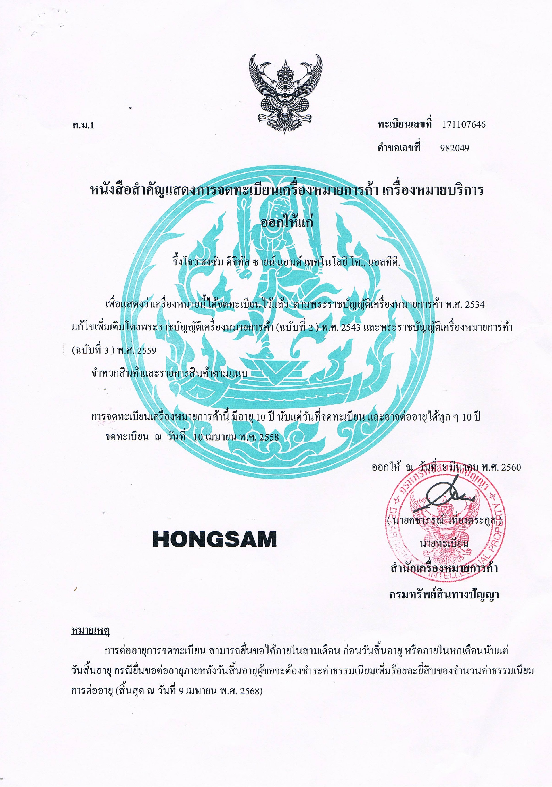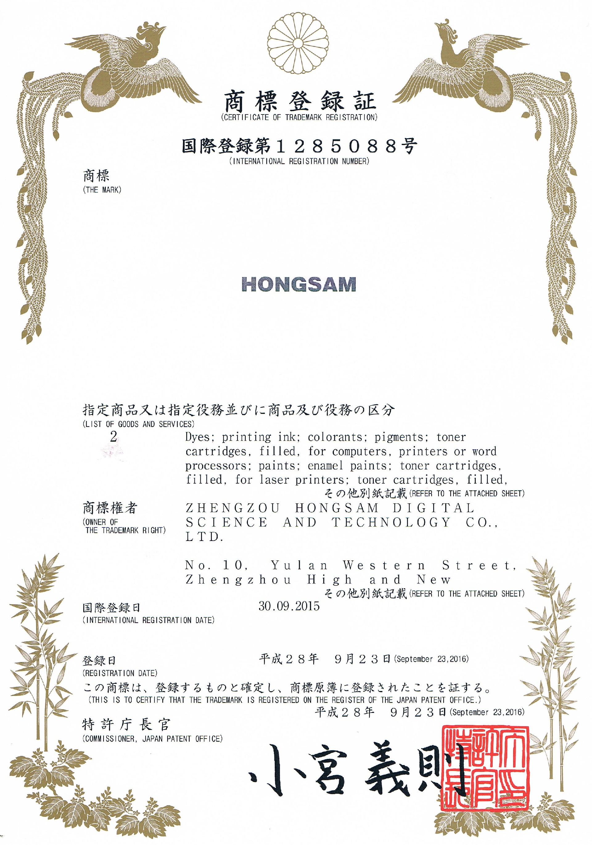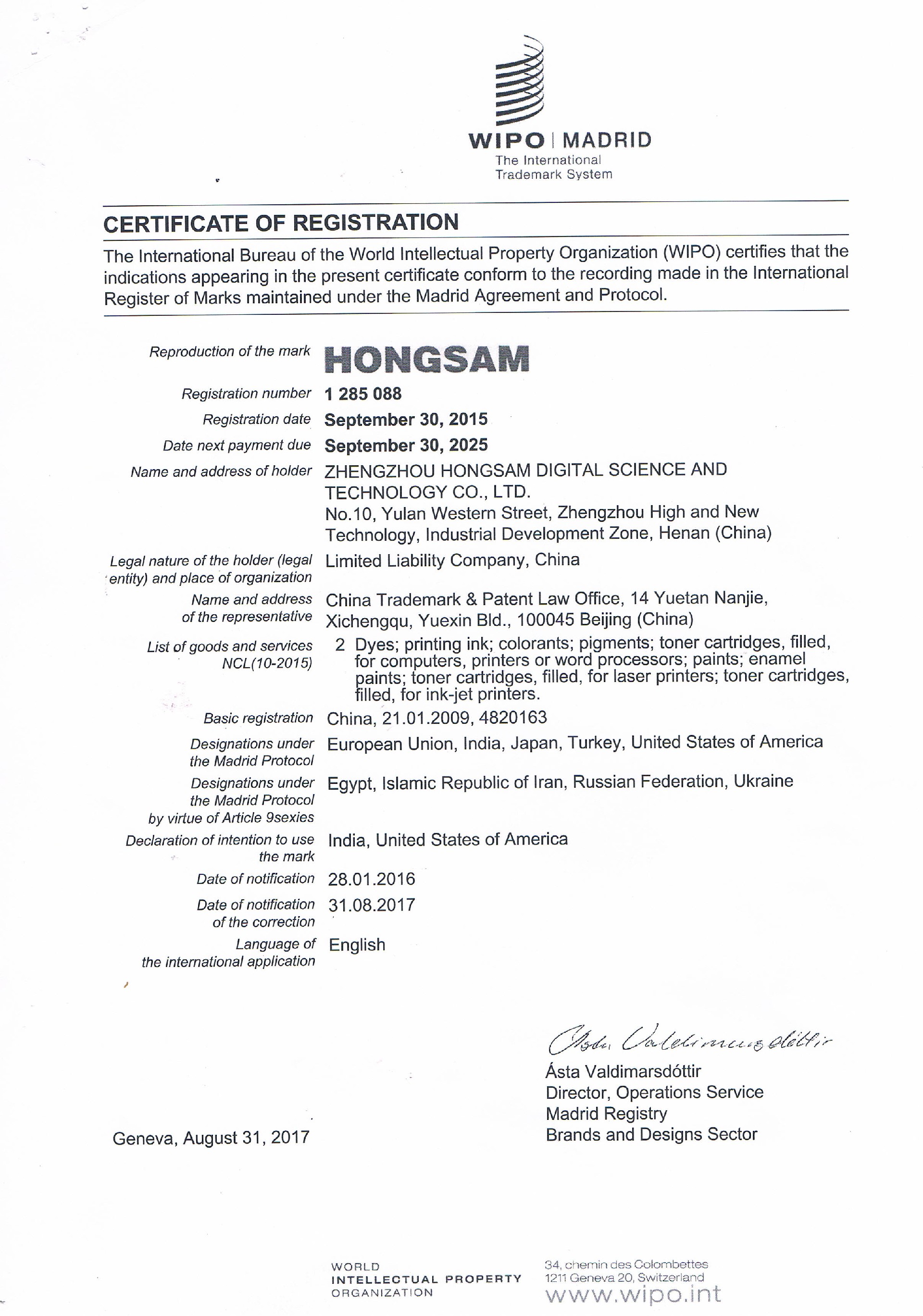 鴻盛數碼一貫重視公司品牌和商標、專利等自有知識產權建設,自公司成立之初就開始全球品牌保護布局。隨著HONGSAM®品牌在世界各國影響力越來越大,公司于2014年12月向設立在瑞士日內瓦的商標國際局正式提出HONGSAM®商標馬德里國際注冊申請,獲核準取得國際商標注冊證書。