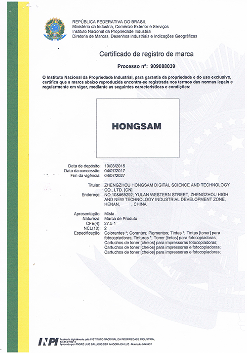 至此,鴻盛數碼HONGSAM®商標專有權在境外的保護范圍已經涵蓋包括歐盟各成員國在內的世界上38個國家,包括:歐盟(包含28個成員國)以及美國、日本、俄羅斯、烏克蘭、印度、土耳其、伊朗以及境外單一注冊的巴西、泰國。
