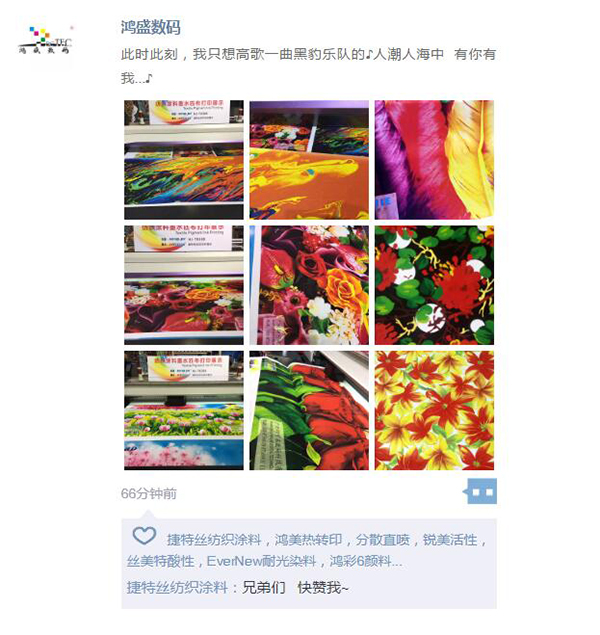 2017廣州(第十二屆)國際紡織品印花工業技術展覽會/國際紡織品數碼印花技術展覽會(CITPE)已于5月26日在廣州落幕。鴻盛數碼此次攜紡織類全系列墨水(涂料 熱轉印 分散 活性 酸性)亮相展會,現場各類墨水的精彩演繹也受到不少客戶的一直好評。
