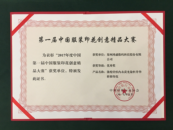 “首屆中國服裝印花創意精品大賽”頒獎儀式于2017年5月22日在廣州舉行,鴻盛數碼參賽面料“滌綸針織內衣熒光升華轉移印花”獲本次大賽優秀獎。