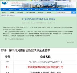 2016年5月26日,鴻盛數碼被河南科技廳認定為“河南省創新型試點企業”。