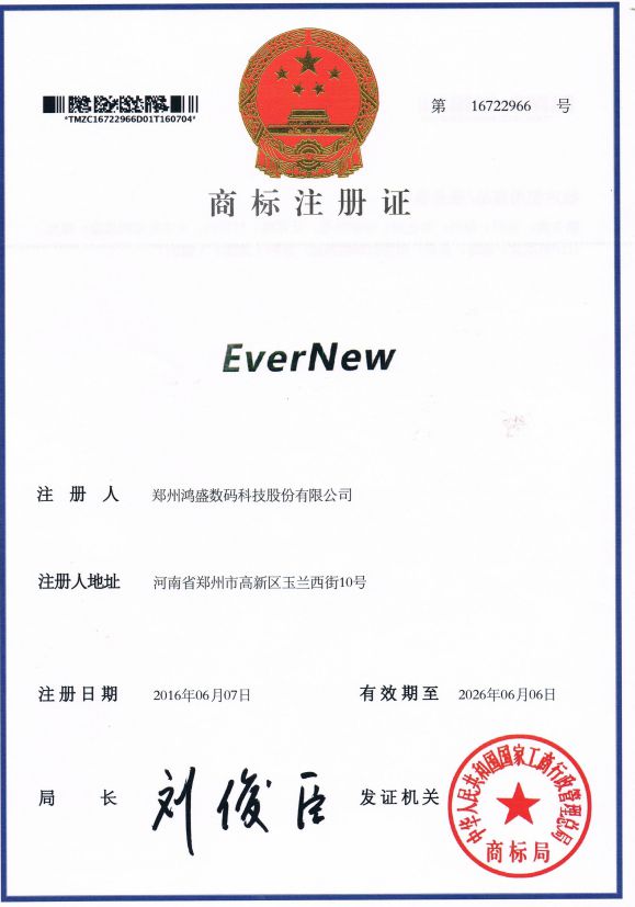 2016年6月7日,鴻盛數碼耐光染料墨水 “EverNew” 商標注冊成功。