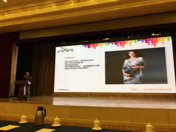 在“2016全國印染行業節能環保年會”現場,鴻盛數碼印花事業部總經理田志榮發表演講《捷特絲紡織涂料墨水無水數碼印花技術的應用研究》