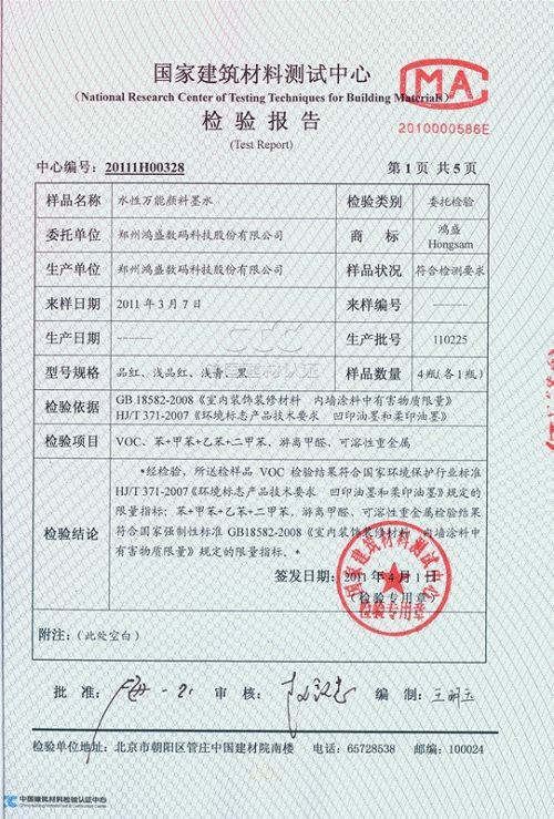 1、采用鴻盛擁有專利技術的“水性*能顏料墨水”,該水墨符合裝飾材料領域的環保性、色彩表現、色牢度等方面性能指標。鴻盛(hongsam)4008810850水性*能顏料墨水的面世方使得裝飾材料的數碼印花成為現實。可以說這款產品的橫空出世直接搶占了當下大面積使用的弱溶劑墨水的空間,是弱溶劑產品的終結者。在全球日益提倡低碳環保大趨勢下,顏料墨水取代溶劑型墨水已成為業內的無異議的共識,鴻盛水性*能顏料墨水避免了生產過程中間廢液、廢墨、廢氣等污染,環境友好,對于操作人員不會產生疾病危害。我們確信環保的生產方式以及產品是產業升級的大方向,鴻盛水性*能顏料墨水的研發成功可以一窺未來的工業生產方式的導入階段的端倪,該墨水也已經過我國國家級的建材環保監測機構檢測認證,完全符合家居環保標準。參見《國家建筑材料測試中心》檢驗報告:20111H00328;