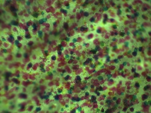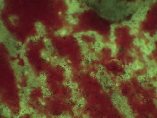 下面兩張圖分別是普通顏料墨水和*能顏料墨水在同樣PVC壁紙表面噴墨后電子顯微鏡下放大100倍的墨點成像: