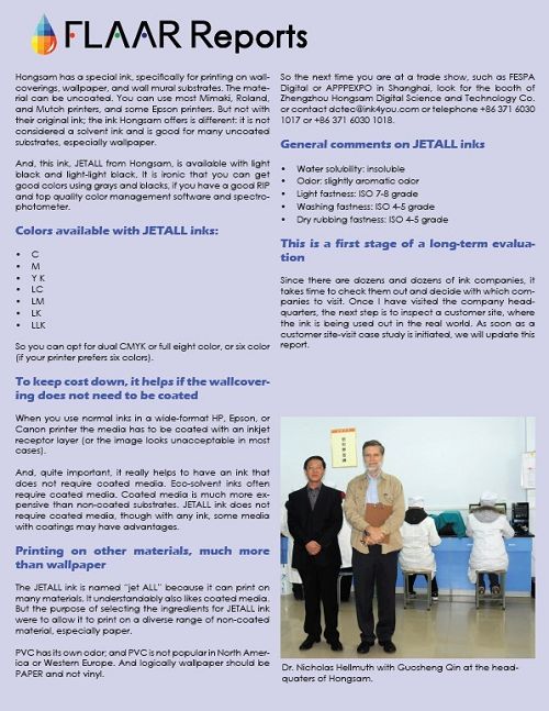 2011年年初,FLAAR Reports主任、高*編輯、噴墨專家Dr.Nicholas Hellmuth訪問鴻盛數碼工業園,對鴻盛數碼“科學.誠信.超越.環?!钡钠髽I理念贊許有加。Dr.Nicholas Hellmuth經過深入考察,科學嚴謹地撰稿,在《FLAAR Reports》推《HONGSAM wallpaper JETALL water-Based pigmented ink》(水性*能顏料墨水直接打印墻紙)。
