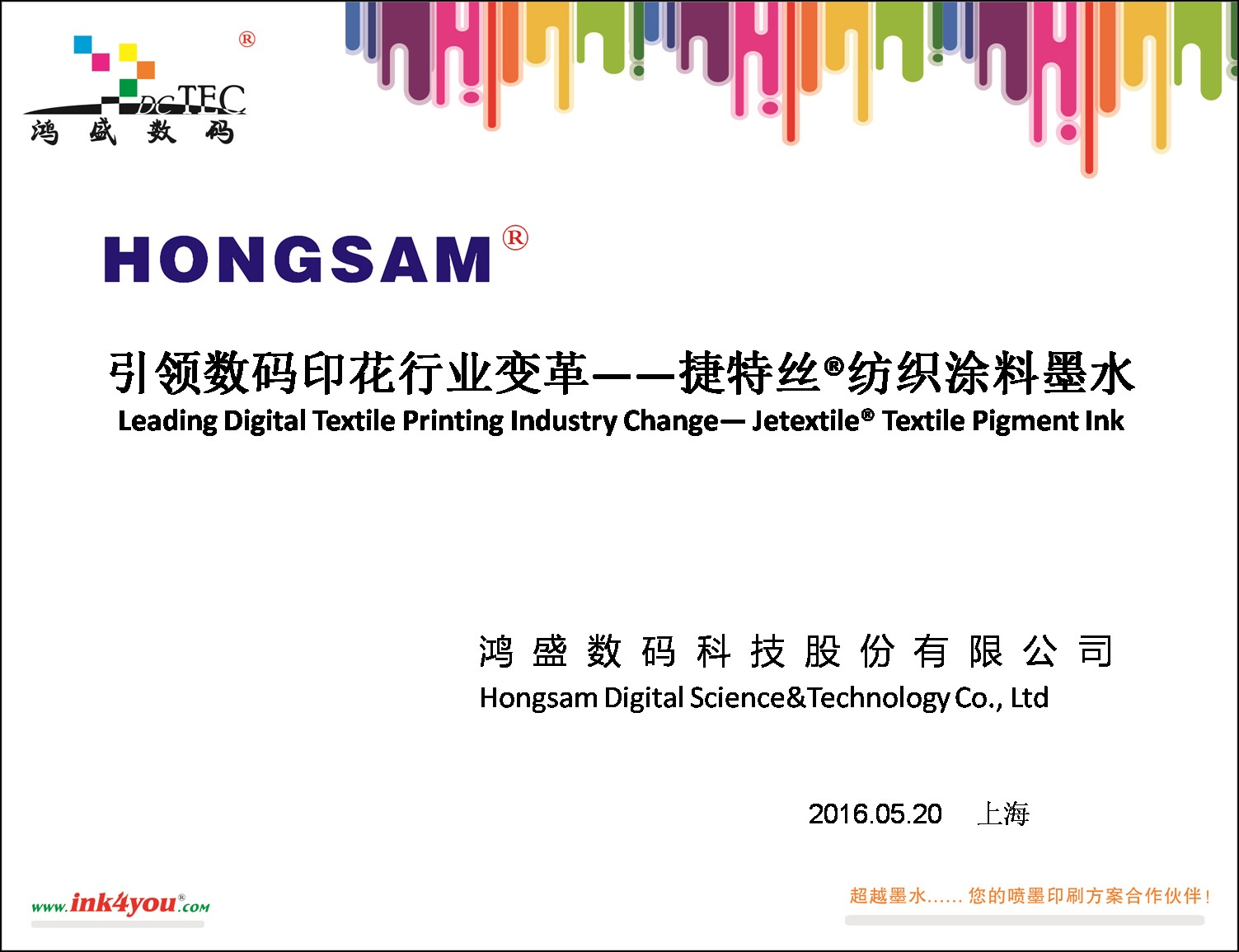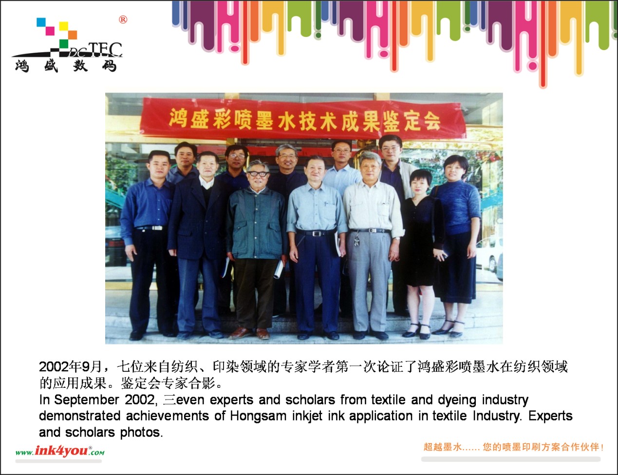 當報告中出現(xiàn)一張拍攝于2002年9月珍貴的合影時,秦國勝說:這是鴻盛數(shù)碼組織專家對鴻盛墨水進行科技成果鑒定,照片中的董永強先生、劉昌齡先生等印染界前輩,在十多年前就給了鴻盛數(shù)碼贊賞和鼓勵。這張照片永遠激勵我們鴻盛人前行,并使我們堅信,數(shù)碼印花一定有美好的未來。