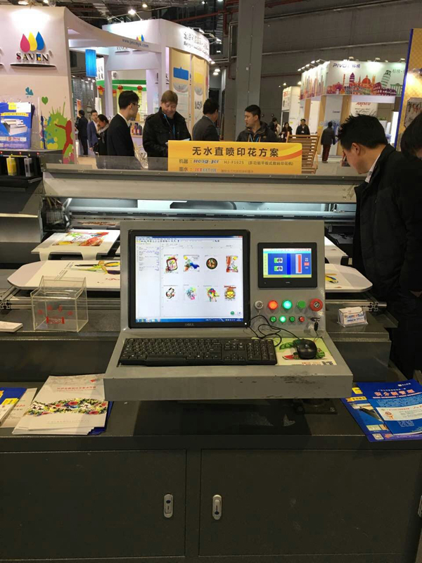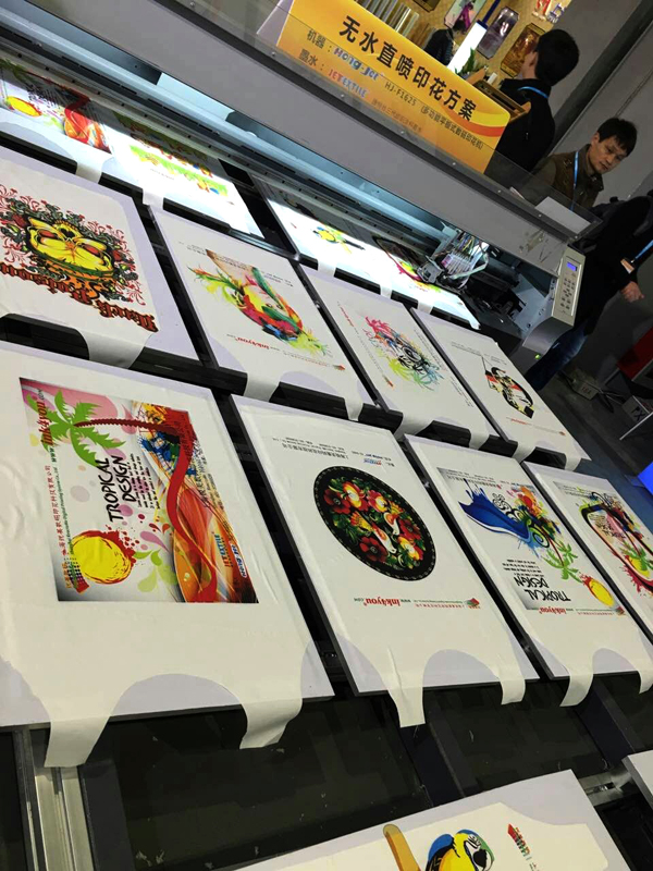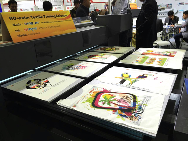 “捷特絲®”紡織涂料墨水適用于幾乎所有面料,可直噴純棉裁片、T恤等印花,工藝簡單,印花后高溫焙烘即是成品,一般不需水洗,沒有污水排放,是真正節能環保的紡織品生產模式。鴻盛數碼使用“捷特絲®”三代紡織涂料墨水在HJ-F1625多功能平板數碼印花機展示了涂料墨水的流暢打印,生產過程中幾乎不用清洗,提升了生產效率,獲得了觀眾的高度認可。