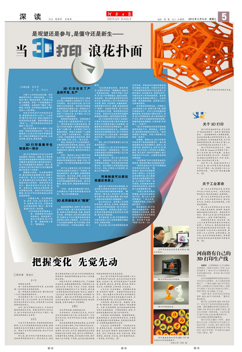 在歲末年初不少經(jīng)濟論壇里,被英國《經(jīng)濟學人》扣上“工業(yè)革命”帽子的3D打印,成為嘉賓不約而同的熱點話題。而在剛剛閉幕的河南省“兩會”上,一些代表委員也在發(fā)言中提到了3D打印。3D打印踏浪而來,“河南制造”如何更好地抓住新技術(shù)、新經(jīng)濟的重大機遇追逐未來?2013年2月6日,河南日報“深讀”板塊一篇題為《當3D打印 浪花撲面》的專題文章,對已經(jīng)投入3D打印技術(shù)應用的河南省先進企業(yè)代表鄭州鴻盛數(shù)碼進行了采訪報道。