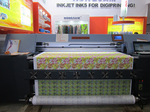 數(shù)碼噴墨印花已然風(fēng)靡全球,HJ-T4160A配合“捷特絲®”二代紡織涂料墨水,在2013廣州國(guó)際廣告標(biāo)識(shí)展,現(xiàn)場(chǎng)直噴純棉坯布印花,讓現(xiàn)場(chǎng)觀眾體驗(yàn)了無(wú)水?dāng)?shù)碼噴墨印花的潮流。HJ-T4160A是一款生產(chǎn)型、工業(yè)化匹布高速數(shù)碼印花機(jī),使用鴻盛活性、酸性、涂料、分散等數(shù)碼印花墨水,滿足各種面料的印花需求。HJ-T4160A采用打印傳動(dòng)系統(tǒng),以及專業(yè)的導(dǎo)帶面料傳送系統(tǒng),而且可以根據(jù)印花圖案的要求,配置墨水顏色數(shù),保證高精度、高品質(zhì)的印花輸出效果。在2013廣州國(guó)際廣告標(biāo)識(shí)展鴻盛展區(qū),HJ-T4160A導(dǎo)帶式數(shù)碼印花機(jī)使用色澤鮮艷、環(huán)保穩(wěn)定的“捷特絲®”二代紡織涂料墨水,以其對(duì)印花色彩和質(zhì)感的高品質(zhì)呈現(xiàn),為現(xiàn)場(chǎng)觀眾譜寫潮流數(shù)碼印花的華麗樂(lè)章!