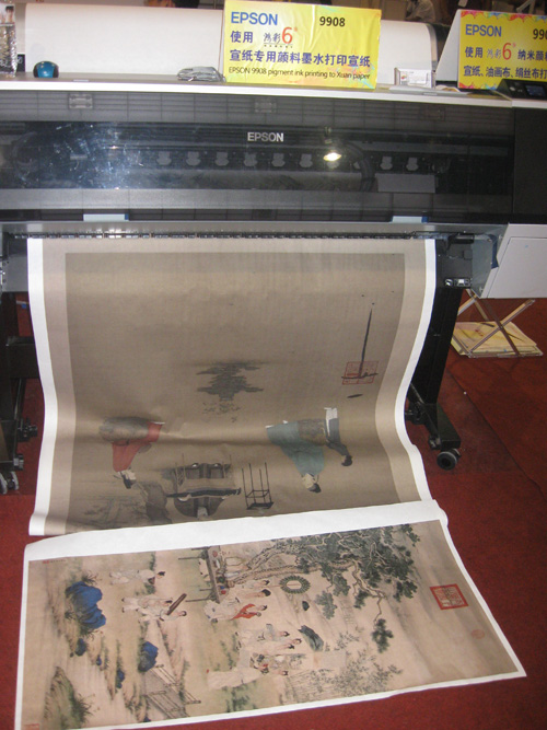 2013第八屆中國框業與裝飾畫展覽會上,鴻盛數碼還現場展示了EPSON 9908使用“鴻彩6®”納米顏料墨水打印宣紙藝術品復制方案。高質量的藝術品復制方案,借助愛普生大幅面噴墨打印機EPSON 9908的“微噴”工藝,通過“鴻彩6®”納米顏料墨水更加鮮艷自然的色彩體現,將藝術品原作的韻味展露無遺,為藝術品愛好者帶來高品質的視覺享受。