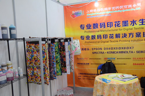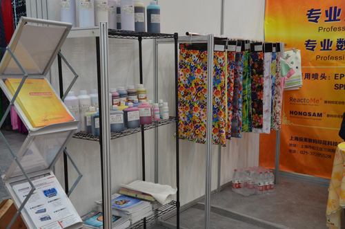 2013中國柯橋國際紡織品博覽會現場,上海銳美為行業客戶展示有“鴻美®”二代熱轉印墨水轉移印花滌綸布樣品;“捷特絲®”二代紡織品涂料墨水打印T恤、棉布樣品;“銳美®”活性染料墨水打印棉布樣品以及紡織品全系列數碼印花墨水產品--“銳美®”活性染料墨水、“鴻美®”二代熱轉印墨水、“旗幟王?”旗幟條幅直噴墨水、“捷特絲®”二代紡織品涂料墨水。另外,本次