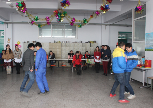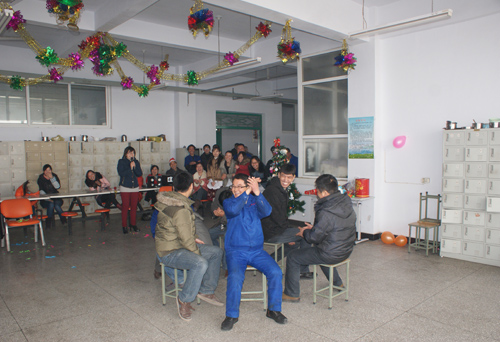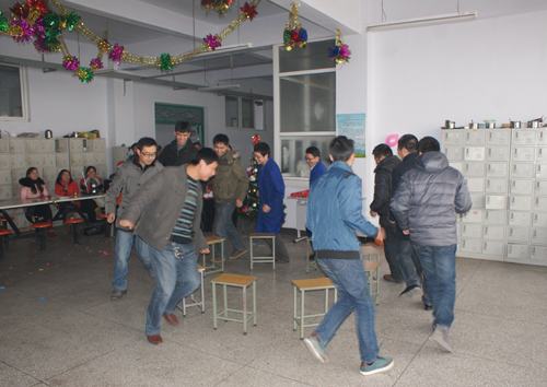 接下來就是歡樂的“坐板凳”游戲了,由10位男員工參加比賽,從10人搶9凳依次激烈爭奪到兩人搶1凳。激烈又歡樂的“坐板凳”游戲在輕松歡快的背景音樂中開始,比賽過程中激烈的爭奪也引發了一次又一次的“全場爆笑”。不斷變換的可愛背景音樂,不斷升級的緊張游戲,將本次驚喜圣誕Party漸漸推向高潮,而取得勝利的“坐板凳”**也拿到了游戲獎品--可愛的洋娃娃。