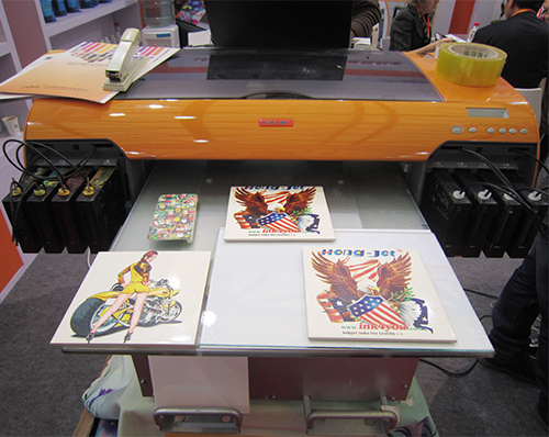 本屆全印展上,鴻盛數碼還現場展示了鴻盛LED-UV光固化噴墨墨水與HJ-F8420-LUV打印機搭檔的應用方案,適用于打印瓷磚、玻璃、手機殼、金屬、亞克力板等材質。
