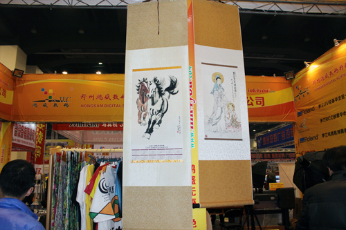 “鴻美®”熱轉印數碼印花,可以將個性定制的任何圖案轉印到匹布、箱包、裝飾布等紡織織物上,以及瓷磚熱轉印印花,木材、金屬等其他材質熱轉印數碼印花。本屆2014中原春季廣告展,鴻盛數碼鄭州東風路分公司將HJ-4162配套“鴻美®”二代熱轉印墨水,現場噴墨打印熱轉印紙,“鴻美®”熱轉印墨水現場表現出的優異流暢性,穩定性,以及打印圖案的靚麗色彩,寬廣色域,加之HJ-4162高性能3.5pl品質畫面的展示,用現場事實代言,贏得眾多展會觀眾駐足欣賞、詢問。