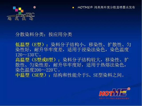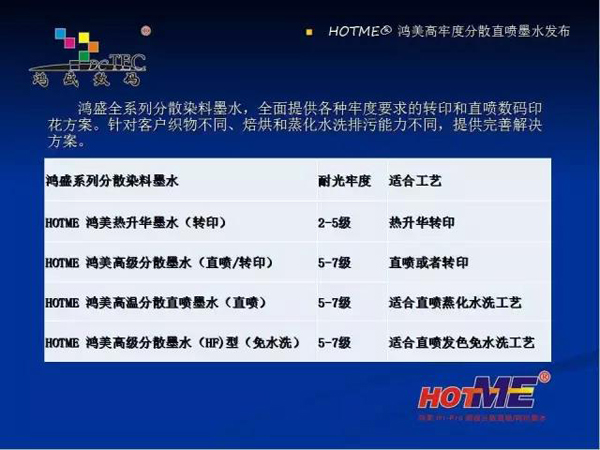 現在鴻盛數碼推出的有四款分散墨水:分別是熱轉印墨水,高日曬熱轉印 / 分散直噴墨水,高溫分散直噴墨水,HF 型(免水洗)分散直噴墨水。適合在滌綸、可染滌綸、丙綸上的數碼印花。下面重點