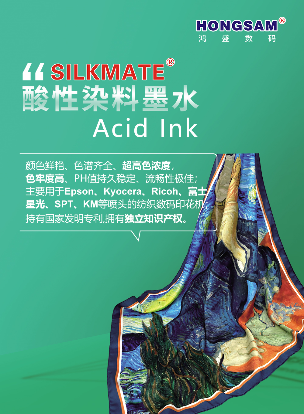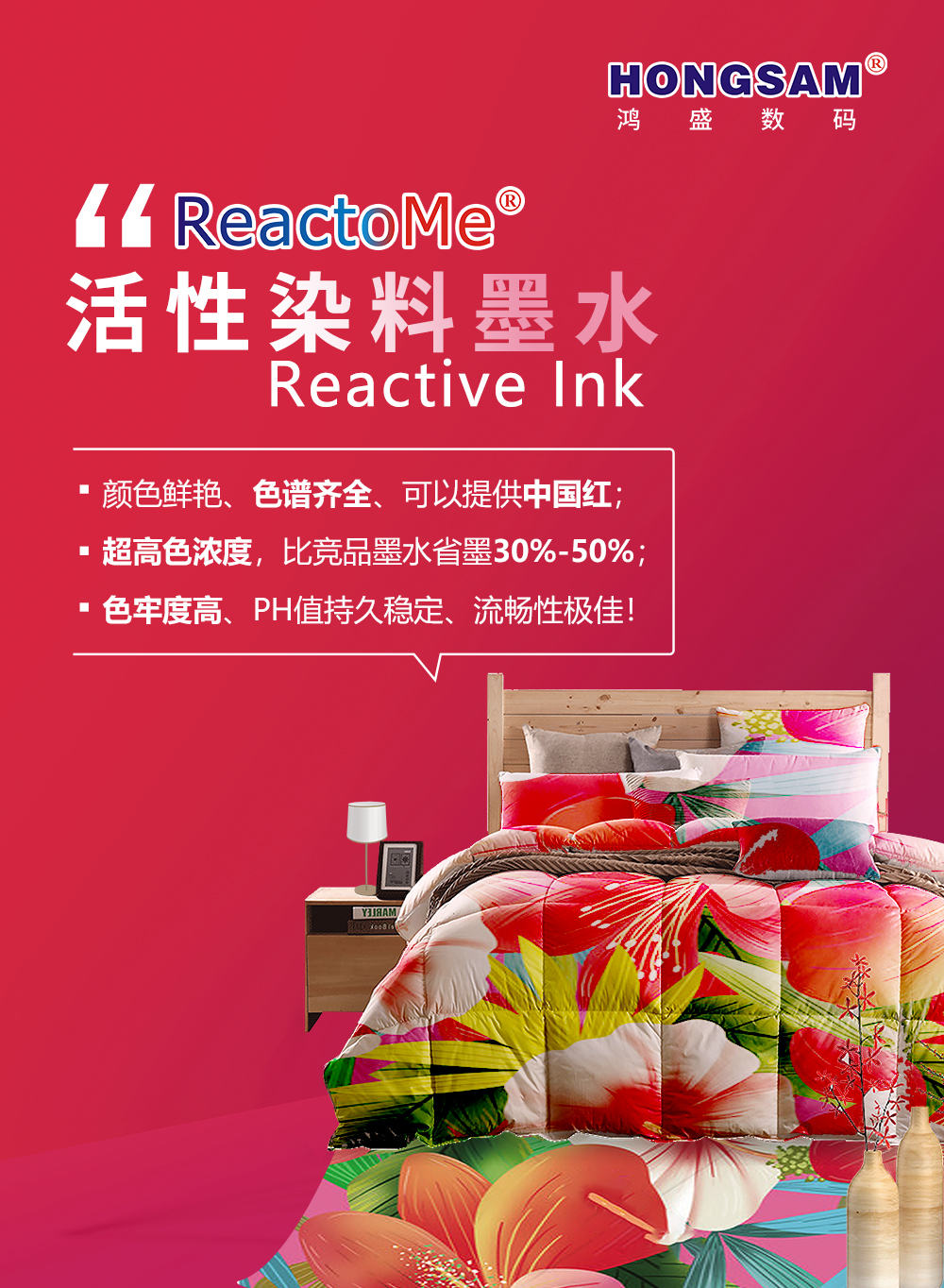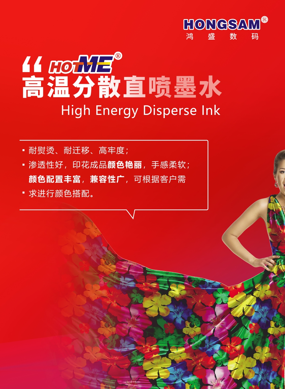 展會,鴻盛數碼將展示旗下數碼印花系列墨水:捷特絲®紡織涂料墨水、鴻美®分散染料墨水、銳美®活性染料墨水、絲美特®酸性染料墨水、鴻盛陽離子染料墨水,以及水性環保