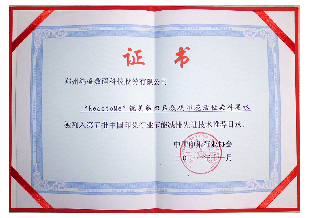 2021年,鴻盛數碼和鄭州大學合作的“數碼噴印墨水制備關鍵技術及其應用”項目榮獲“中國紡織工業聯合會科技進步二等獎”