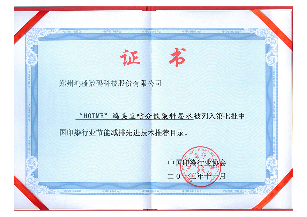 2013年,鴻美分散染料墨水被列入第七批《中國印染行業節能減排先進技術推薦目錄》