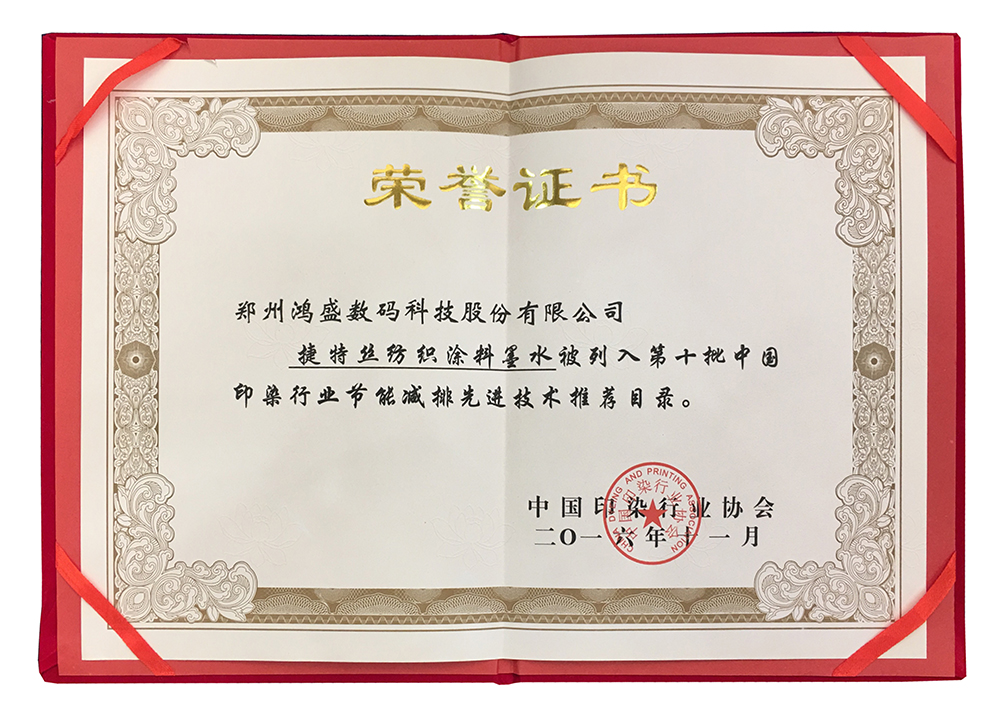 2016年,捷特絲紡織涂料墨水被列入第十批《中國印染行業節能減排先進技術推薦目錄》