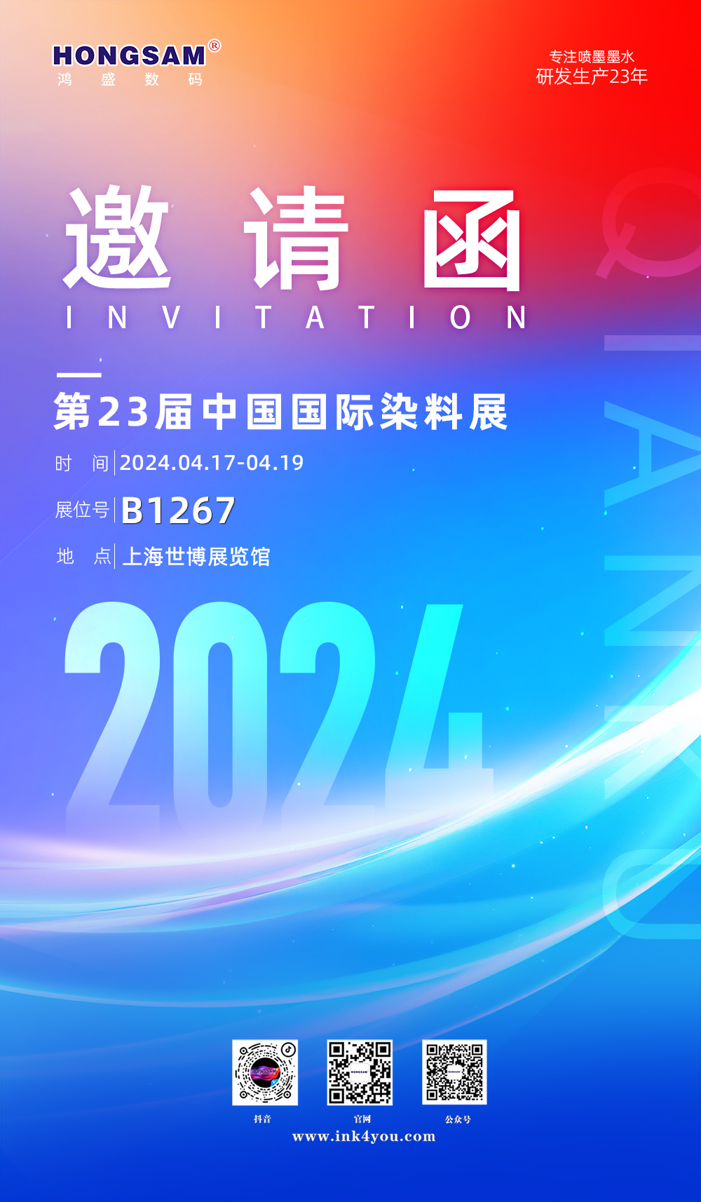 第23屆中國國際染料工業及有機顏料、紡織化學品展覽會將于2024年4月17~19日在上海世博展覽館盛大開展。鴻盛數碼本次也如約參展,展位號:B1267,誠邀您的蒞臨!