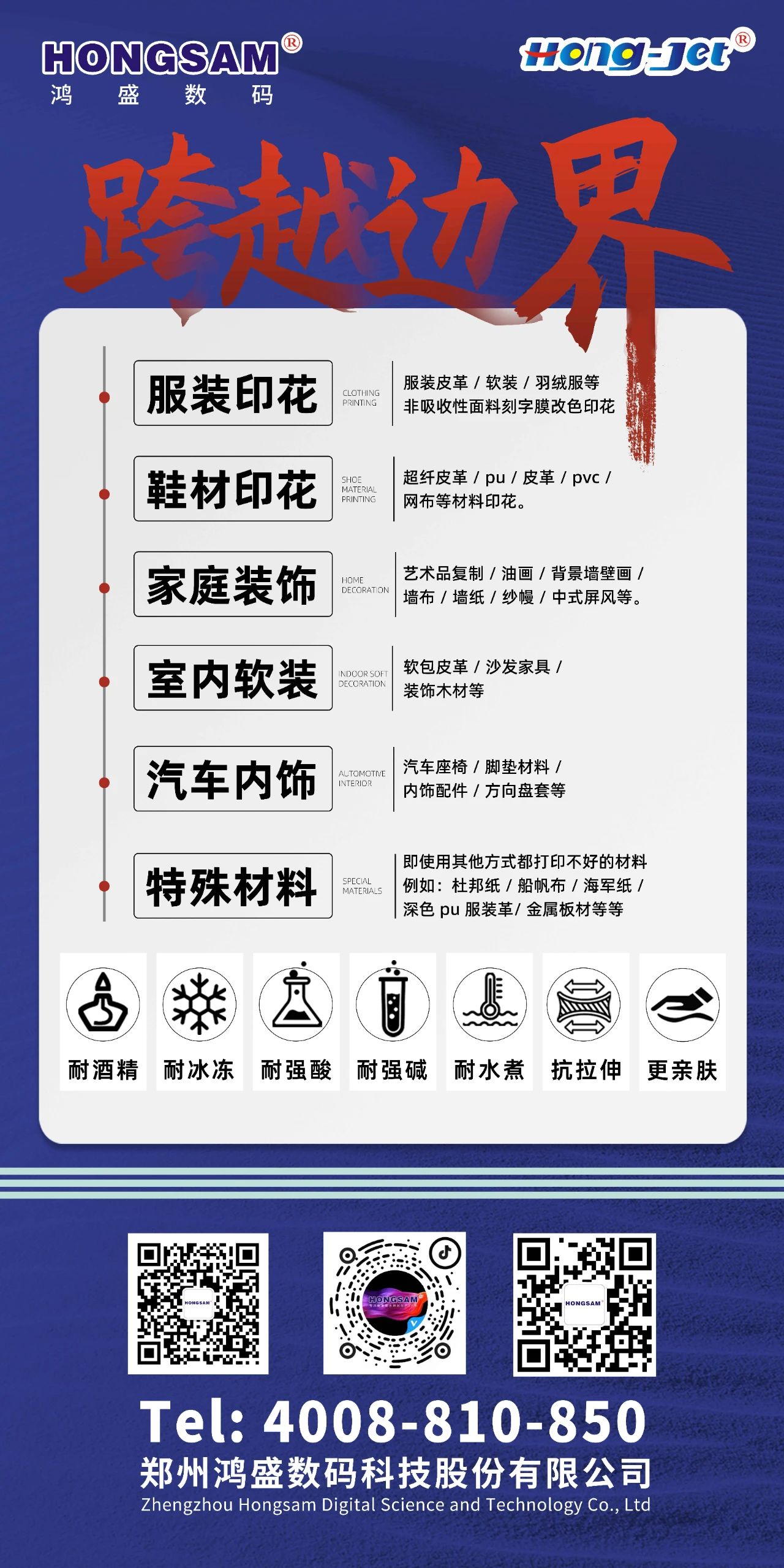 本次展會,鴻盛數碼(展位號:E2-E14a)將攜HJ-1808L皮革打印機、HJ-1802L皮革打印機、水性乳膠打印方案、鴻盛數碼全系列墨水(數碼印花、數碼影像、數碼印刷)等多款主力產品重磅出席此次展會。