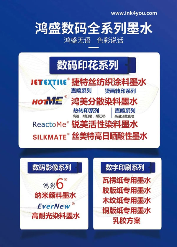 本次展會,鴻盛數碼(展位號:A1-Hall 208)將攜鴻盛數碼全系列墨水(數碼印花、數碼影像、數碼印刷)等多款主力產品重磅出席此次展會。歡迎各位行業精英現場交流!作為全系列紡織噴墨墨水生產商,鴻盛數碼噴墨印花墨水具備色譜齊全,顏色靚麗,色牢度高,安全環保等優點,其豐富的配色方案可以滿足不同客戶的印花需求。經過二十多年的行業深耕,鴻盛數碼得到了行業的認可和贊譽。
