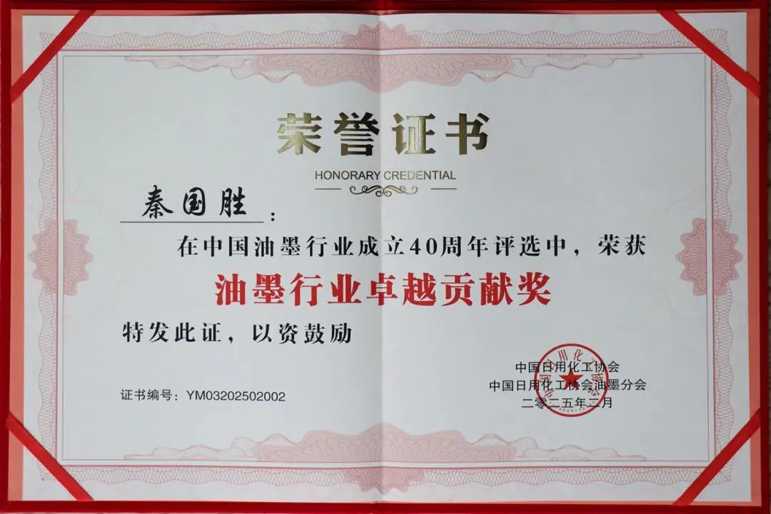 ?2025年2月,公司榮獲“油墨行業(yè)可持續(xù)發(fā)展企業(yè)”,公司董事長秦國勝先生榮獲“油墨行業(yè)卓越貢獻(xiàn)獎(jiǎng)”。