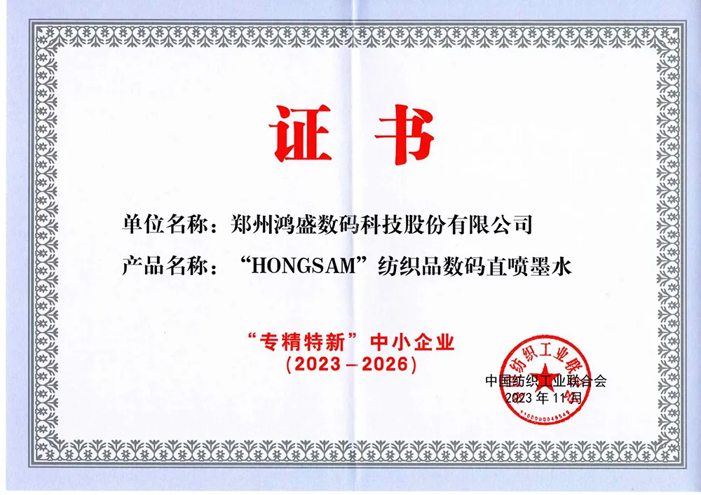 ?2021年,鴻盛數(shù)碼和鄭州大學(xué)合作的“數(shù)碼噴印墨水制備關(guān)鍵技術(shù)及其應(yīng)用”項(xiàng)目榮獲“中國紡織工業(yè)聯(lián)合會(huì)科技進(jìn)步二等獎(jiǎng)”