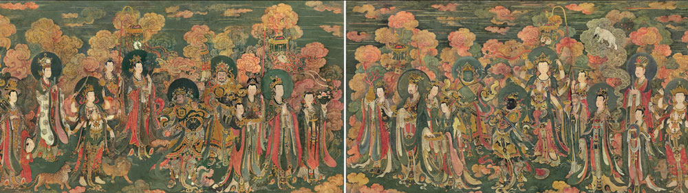 這幅壁畫全長10米,高2米,繪有20位諸天神像,共36個人物。如何區分諸天神像與侍從?答案在于光環。世界三大宗教中,信奉的神靈都有光環,因此頭戴光環的是諸天神像,沒有光環的則是神像侍從。