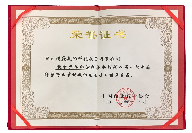 5、捷特絲紡織涂料墨水2016年成功入選《中國印染行業協會第十批節能減排先進技術推薦目錄》;